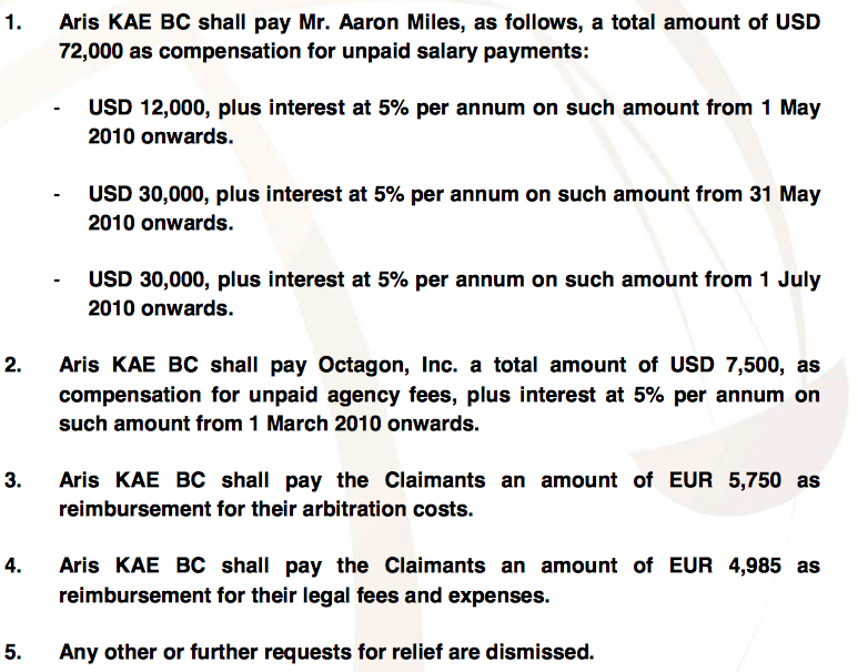 Το PRESSARIS σας παρουσιάζει και πάλι την δικαστική απόφαση για την οφειλή της ΚΑΕ στον Αμερικανό πλέι μέικερ και τους εκπροσώπους του. Στον Μάιλς έχουν επιδικαστεί 72.000 δολάρια (συν 5% προσαυξήσεις για κάθε χρόνο από την 1/5/10 και μετά) και στην Όκταγκον 7.5000 δολάρια (και το ίδιο ποσοστό προσαύξησης). Επίσης, η ΚΑΕ καλείται να πληρώσει σχεδόν 11.000 ευρώ δικαστικά έξοδα.