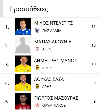 Από πάνω του στις προσπάθειες είναι ο Δημήτρης Μάνος με 10, ο οποίος έχει βρει και δύο φορές τον δρόμο προς τα δίχτυα, κατέχοντας την 5η θέση των σκόρερ μαζί με τους Ανσαριφάρντ (ΑΕΚ), Χασάν (Ολυμπιακός), Σφιντέρσκι (ΠΑΟΚ), Ντουρμισάι (ΑΕΛ), Βέργος (Παναιτωλικός).