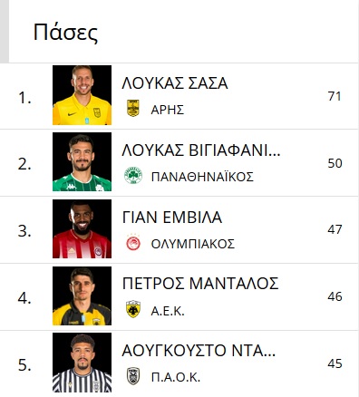 Ο Λούκας Σάσα έχει παίξει και στα πέντε αυτά ματς ως βασικός σε όλα τα 90λεπτα. Ο Βραζιλιάνος μέσος βρίσκεται στην 1η θέση στις εύστοχες πάσες, έχοντας τροφοδοτήσει 71 φορές τους συμπαίκτες και με μεγάλη διαφορά από τον δεύτερο, που είναι ο Λούκας Βιγιαφάνες του Παναθηναϊκού με 50. Ακόμα, κατέχει την 2η θέση -ουσιαστικά την πρώτη όμως γιατί τον περνάει μόνο ο Διούδης του Παναθηναϊκού- στα κλεψίματα με 24 με τον επόμενο μη τερματοφύλακα να είναι ο Στέφαν Σβαμπ του ΠΑΟΚ με 19.