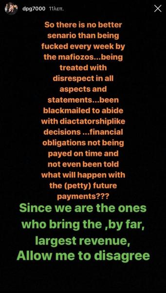 Επομένως δεν υπάρχει καλύτερο σενάριο από το να μας γ…ε οι μαφιόζοι κάθε εβδομάδα… να αντιμετωπιζόμαστε με ασέβεια σε όλες τις πτυχές και στις δηλώσεις… να εκβιάζονται και να συμμορφώνονται με δικτατορικές αποφάσεις… οικονομικές υποχρεώσεις δεν πληρώνονται εγκαίρως και ούτε καν είπε τι θα συμβεί στο (άμεσο) μέλλον με τις πληρωμές; Επειδή είμαστε αυτοί που προσφέρουν τα μεγαλύτερα έσοδα, επιτρέψτε μου να διαφωνήσω».