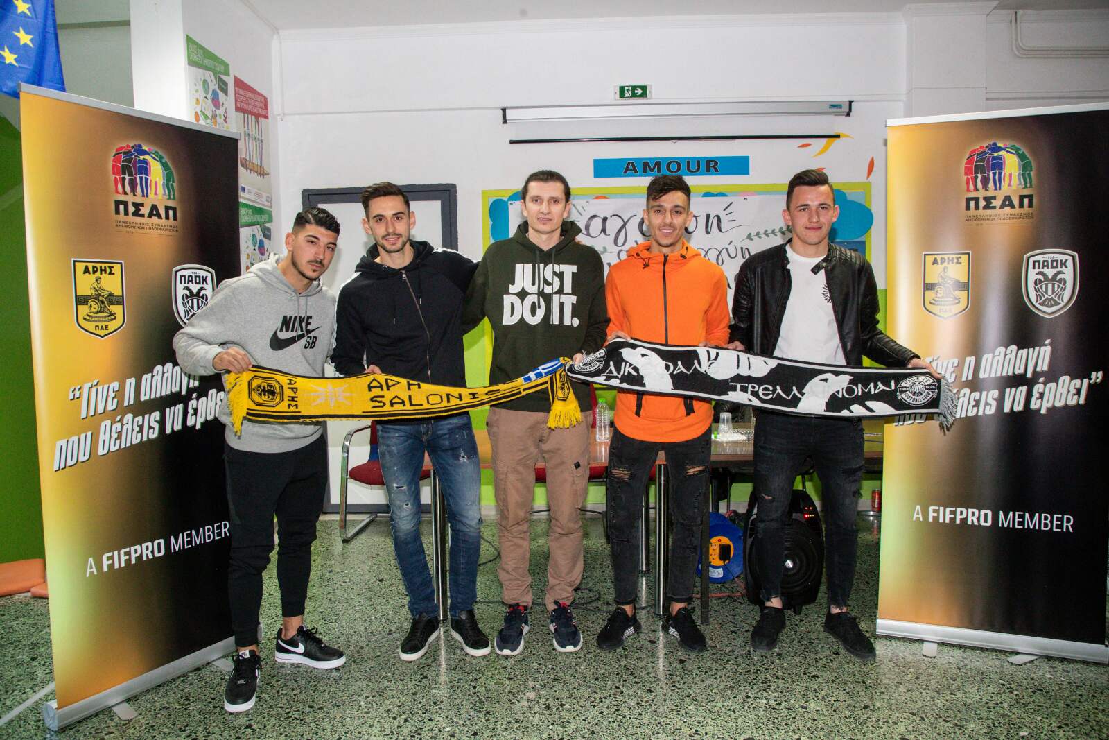 «Λίγο πριν αγωνιστούν μεταξύ τους για τους αγώνες των πλέι οφ του πρωταθλήματος της Superleague, οι Φιορίν Ντουρμισάι, Απόστολος Τσιλιγγίρης από τον Άρη και Δημήτρης Λημνιός, Δημήτρης Γιαννούλης από τον ΠΑΟΚ, συνοδευόμενοι από αντιπροσωπεία του ΠΣΑΠ, επισκεφθήκαμε το 1ο και 2ο Δημοτικό Σχολείο Πλαγιαρίου Θεσσαλονίκης και μιλήσαμε στα παιδιά για τις πραγματικές αξίες του αθλητισμού.