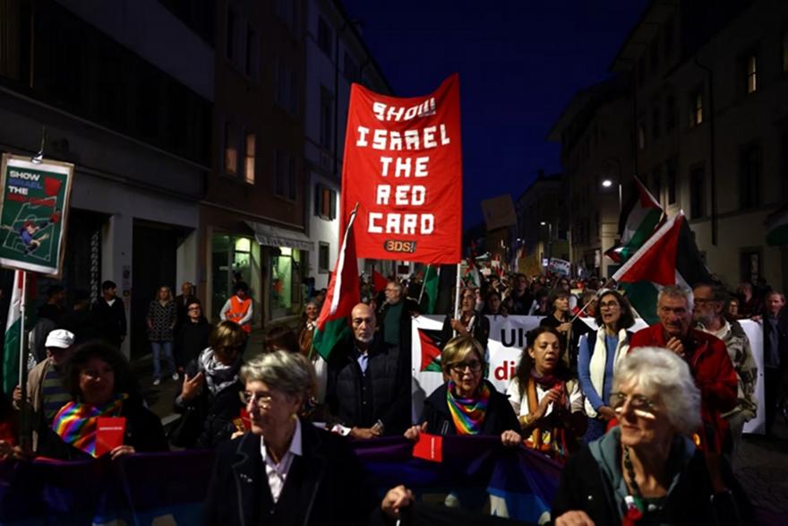 Συγκεκριμένα, χιλιάδες φιλοπαλαιστίνιοι διαδηλωτές βγήκαν στους δρόμους της πόλης και φώναζαν συνθήματα όπως «Ελεύθερη Παλαιστίνη» ενώ κρατούσαν πλακάτ που έγραφαν «Δείξτε στο Ισραήλ την κόκκινη κάρτα».