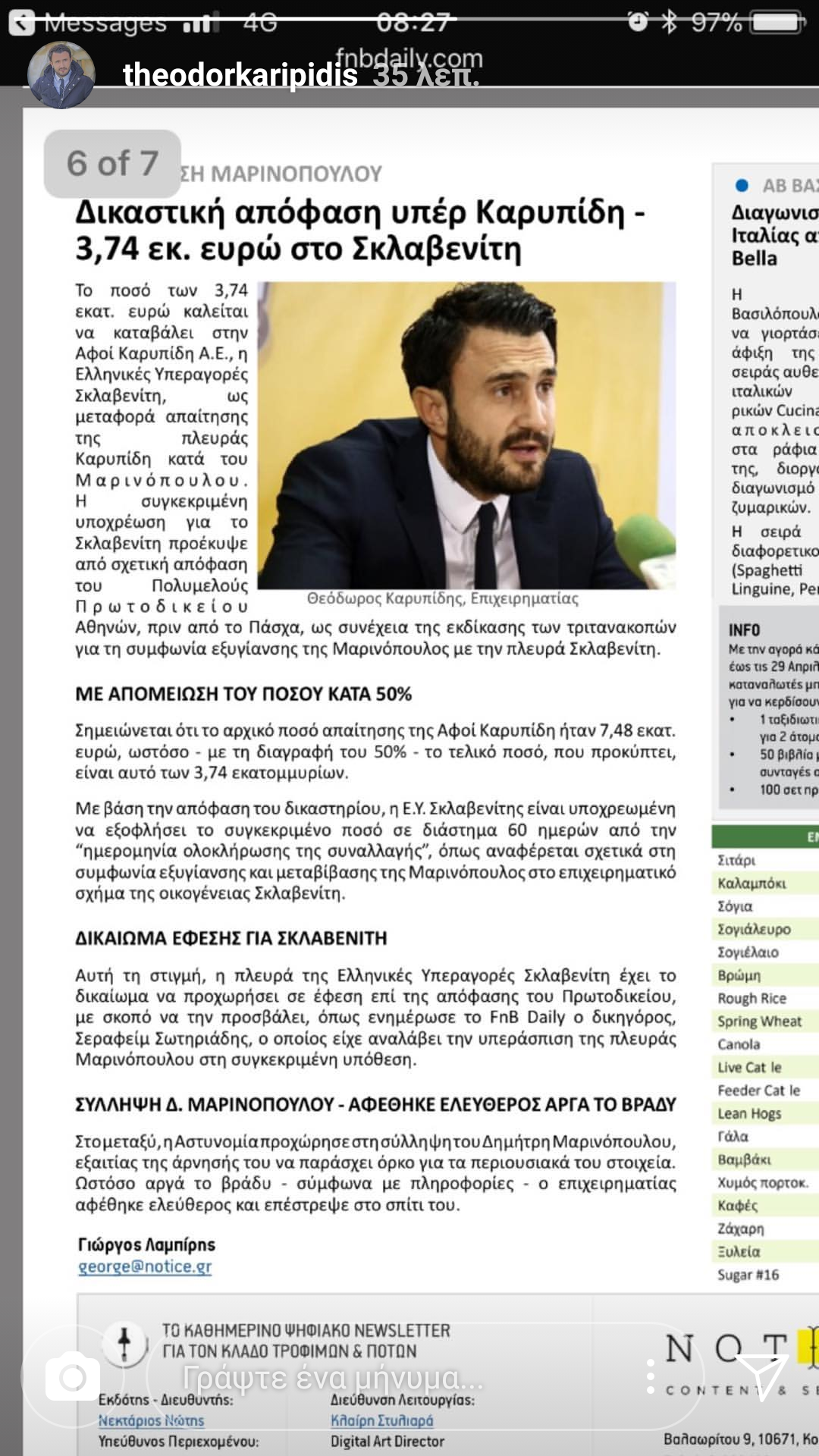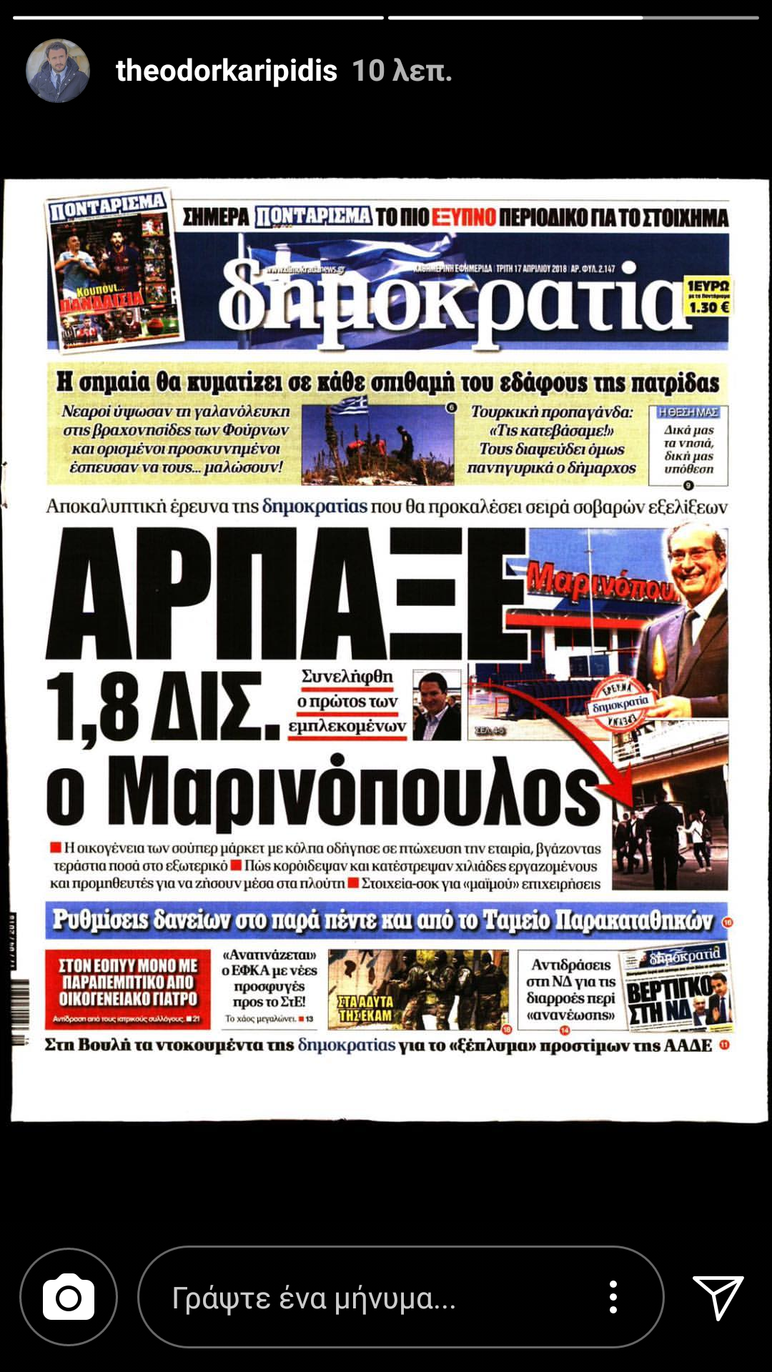 Το ποστάρισμα του Καρυπίδη για Σκλαβενίτη και Μαρινόπουλο (photos) PRESSARIS 17 Απριλίου 2018 Share Tweet Share Share Email Comments Ο Θοδωρής Καρυπίδης ποστάρισε δύο φωτογραφίες στον προσωπικό του λογαριασμό στο instagram αναφορικά με τη διαμάχη που υφίσταται εδώ και χρόνια με τον Μαρινόπουλο. Δείτε τις φωτογραφίες… ΣΧΕΤΙΚΑ Share Tweet Share Share Email