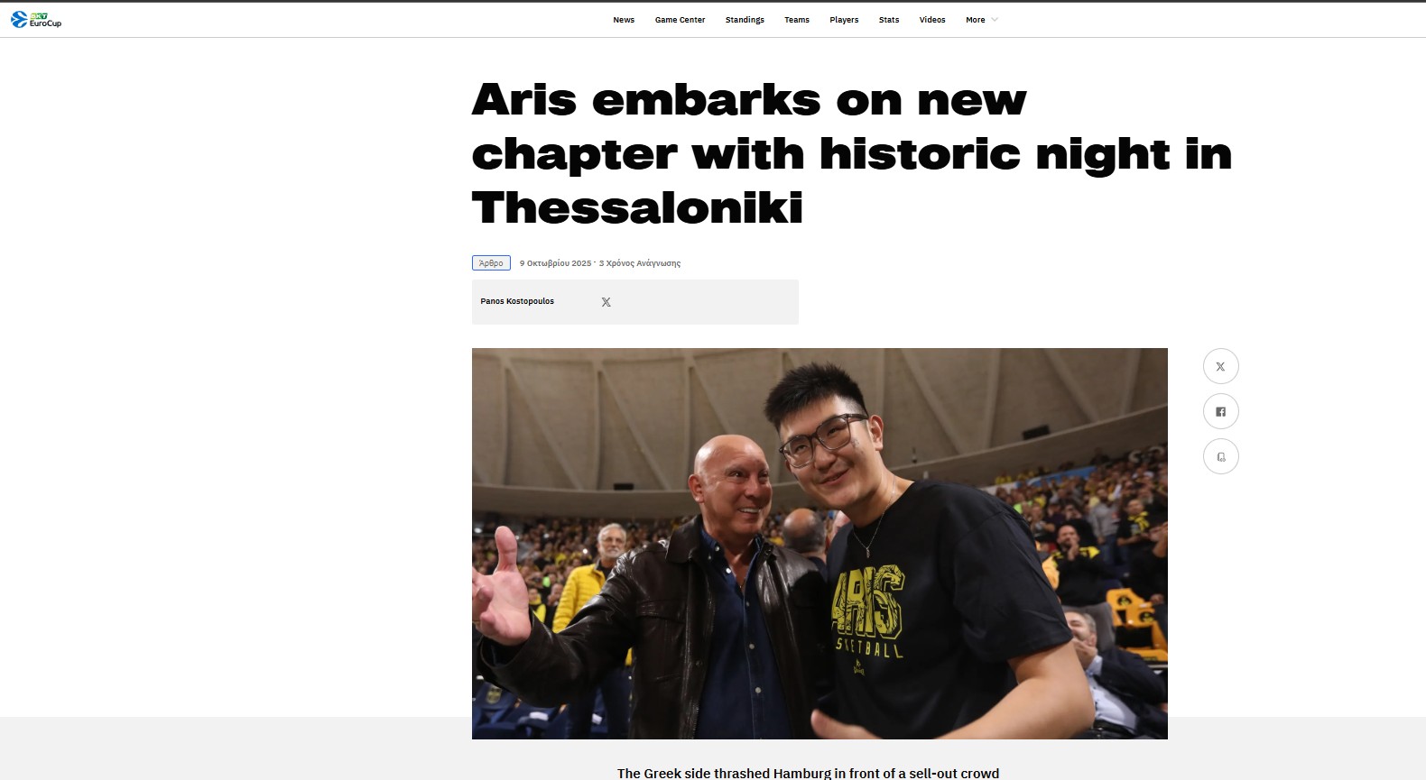 Στη συνέχεια τονίζονται τα εξής: «Μια πολλά υποσχόμενη σεζόν στο EuroCup για τη σεζόν 2025-26 ξεκίνησε με μια μεγάλη νίκη εκτός έδρας στο Umana Reyer Venice την περασμένη εβδομάδα, δίνοντας τον τόνο για ό,τι επρόκειτο να ακολουθήσει το βράδυ της Τετάρτης. Ένα sold-out πλήθος γέμισε τις κερκίδες, με τον Σιάο, που παρακολούθησε τον πρώτο του αγώνα με τον ‘Αρη να απολαμβάνει κάθε στιγμή. Ο σύλλογος κάλεσε επίσης τον θρύλο Νίκο Γκάλη, ο οποίος κάθισε στις κερκίδες ενός γηπέδου όπου έγραψε ιστορία με μερικές αξέχαστες εμφανίσεις τη δεκαετία του 1980.