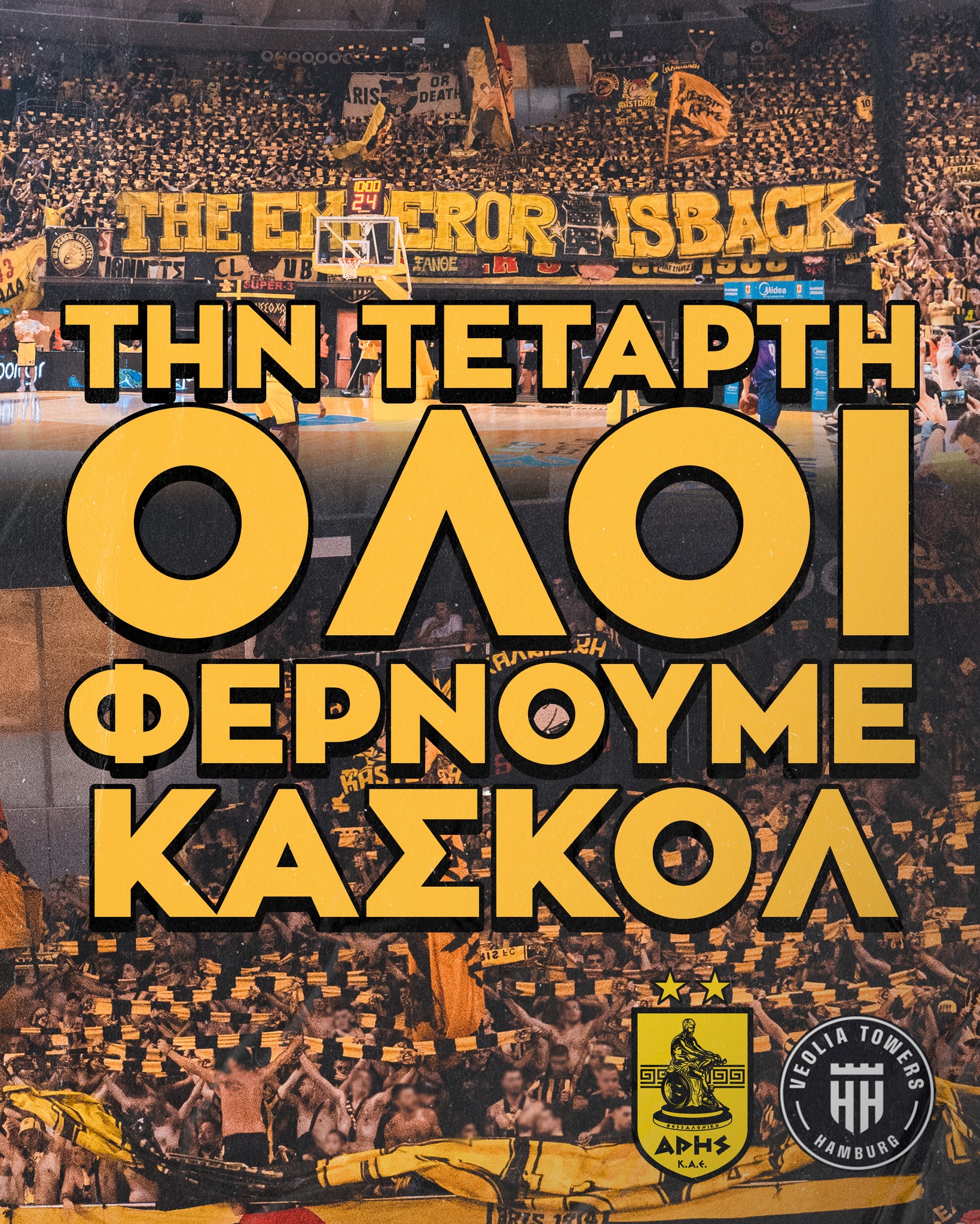Από την πλευρά μας ζητάμε από τους τυχερούς που θα είναι στο Παλε να έχουν ΟΛΟΙ μαζί τους κασκόλ και να είναι στο γήπεδο όσο το δυνατόν νωρίτερα! Για όσα αδέρφια δεν έχουν κασκόλ, θα υπάρχουν τις επόμενες μέρες στο Σύνδεσμο, καθώς και την ημέρα του ματς στο καφέ του Παλέ. Όλοι μαζί αδέρφια για μια ατμόσφαιρα που θα γίνει—ξανά—σημείο αναφοράς πανευρωπαϊκά. Ενα Παλε κίτρινο από άκρη σε άκρη, με 5500 κασκόλ ψηλά και ένα «ΑΡΗ θυμίσου» που θα είναι τόσο γνώριμο σε εμάς, μα τόσο πρωτόγνωρο στους αθλητές μας (και όχι μόνο).